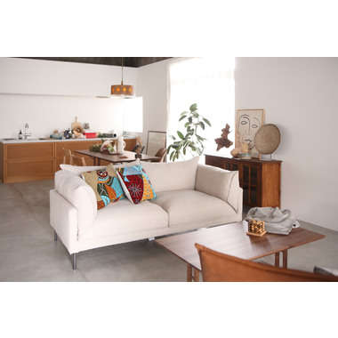 細いスチール脚と重厚感のあるクッションのバランスが魅力的なモダンデザインのソファです。ボリュームのあるクッションが体全体を優しく包み込みます。