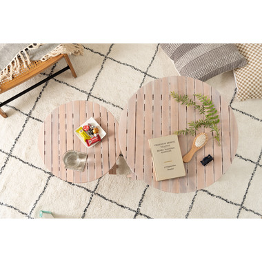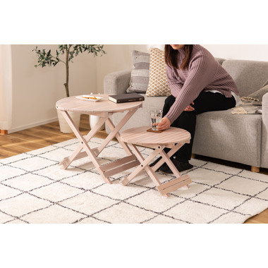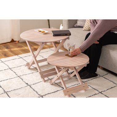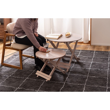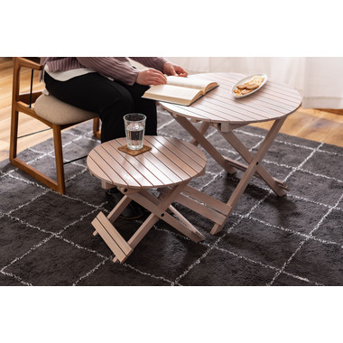 ●工具不要で簡単組み立て、ワンタッチで折りたためる便利なラウンドテーブル。●折りたたみ時の“持ち手”で移動もしやすく、様々なシーンで大活躍。●コンパクトでちょうどいいサイズ。●大・小を組み合わせてネストテーブルとしても使えます。●折りたたみ時の厚さは、Sサイズで5cm、Lサイズで6cmと薄型に。ベッド下やクローゼットなどの隙間に収納が可能。●脚裏にはフェルトが付いているので床への傷防止にもなり安心です。