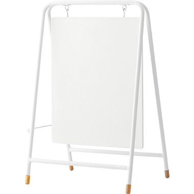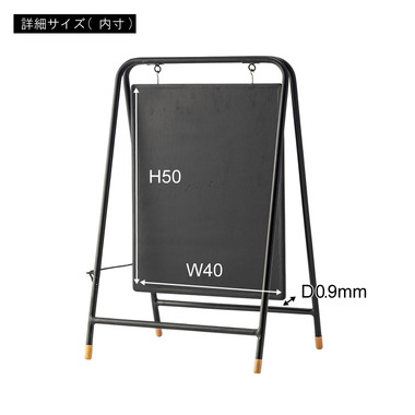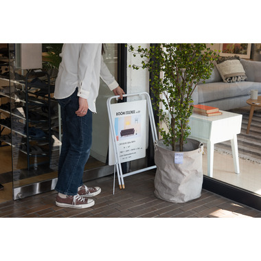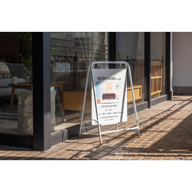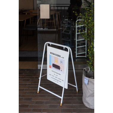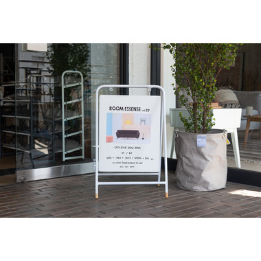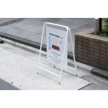 スチールフレームと木製の脚キャップの組み合わせでスタイリッシュな印象を与えるサインボード。