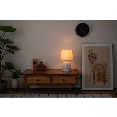 ●ありそうで無かった「陶器+ファブリック」の組合わせがお洒落なテーブルライト。●デスク上ではもちろん、ソファサイド・ベッドサイド等いろいろな場所で活躍。●シェードは角度を調整する事が出来るので、間接照明としてだけでなく、補助灯としても使えます。●読書タイムの空間を落ち着かせてくれるだけでなく眼にも優しいので、おやすみ前のリラックスタイムにもぴったり。●リラックスタイムが終わったら、手元のスイッチですぐに消灯できます。●テーブルライトは夜間だけでなく、日中のインテリアにも最適。ちょっと物足りなかった空間も、置くだけでグレードアップ。●テーブルライトをお部屋に取り入れて日々の生活をワンラックUP。