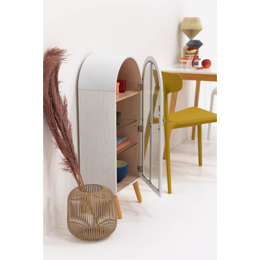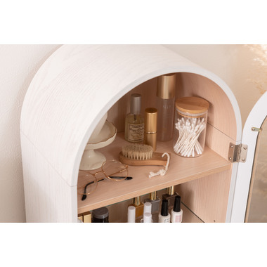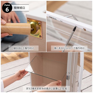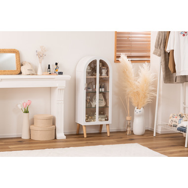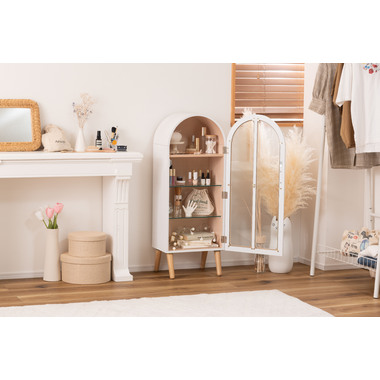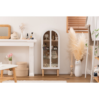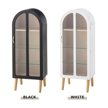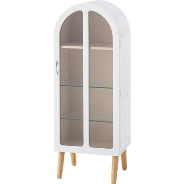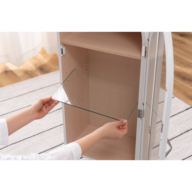 ●洋風のアンティーク扉のような、可愛いフォルムのコレクションシェルフ。●アーチ状の曲線を描く丸みを帯びた愛らしいデザイン。●大きすぎず小さすぎず様々な場所に置ける丁度良いサイズ。●扉の本体側にマグネット受けがあるので、ピタッと扉を閉めることができます。●棚は全部で3つ。一番上の棚は固定タイプ。2段目・3段目はガラス板を使い高さ調整が可能。それぞれ3段階の高さ調整ができます。●ガラス板は5mm強化ガラスを使用しているので強度面も安心。●天然木オーク(突板)の木目を活かしたデザインなので、ナチュラルな雰囲気やガーリーな雰囲気の家具との相性も抜群。●脚はねじ込みタイプの簡単組立式。 ※取っ手を取り付ける際にプラスドライバーが必要となります。