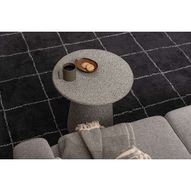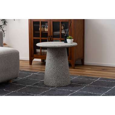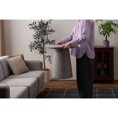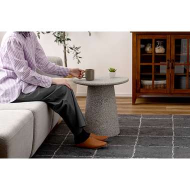 洗練された印象をもたらす上品なラウンドテーブル。本物の石のようにざらりとしたシックなテラゾー柄が、空間にやさしい奥行きを加えます。丸みのある天板と安定感のある裾広がりのベースがバランスよくまとまり、上質で心地よいバランスを演出。様々なインテリアと相性よくなじみ、ディスプレイ台としても活躍します。単体ではもちろん、サイズ違いで並べればネストテーブルとしても使用できます。