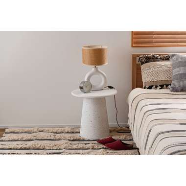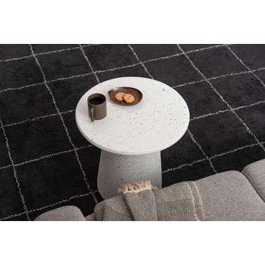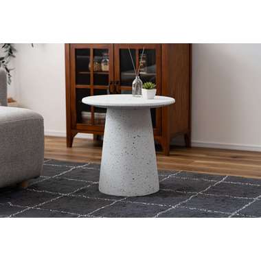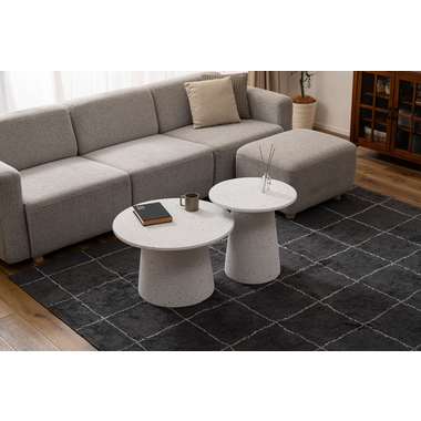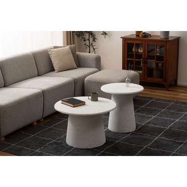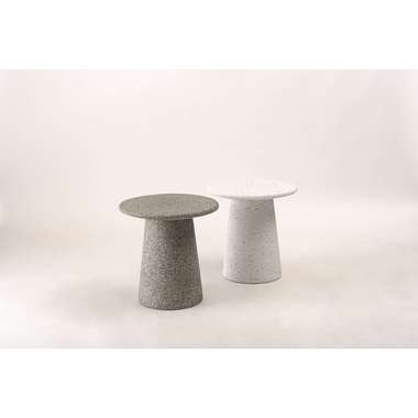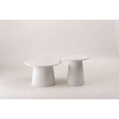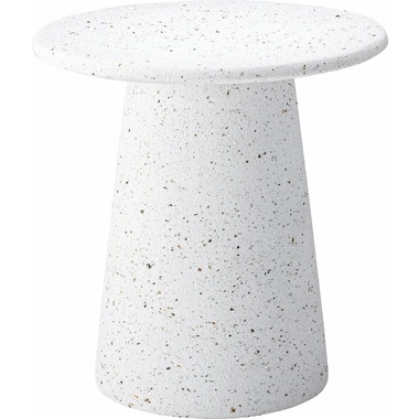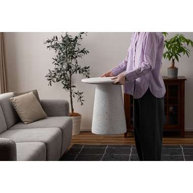 洗練された印象をもたらす上品なラウンドテーブル。本物の石のようにざらりとしたシックなテラゾー柄が、空間にやさしい奥行きを加えます。丸みのある天板と安定感のある裾広がりのベースがバランスよくまとまり、上質で心地よいバランスを演出。様々なインテリアと相性よくなじみ、ディスプレイ台としても活躍します。単体ではもちろん、サイズ違いで並べればネストテーブルとしても使用できます。