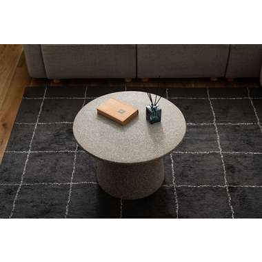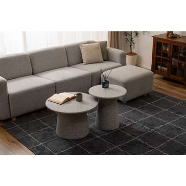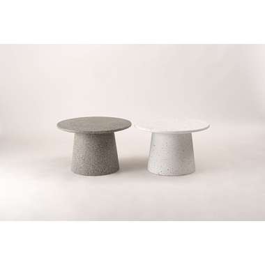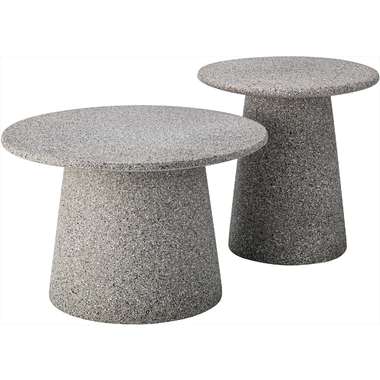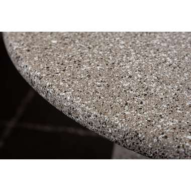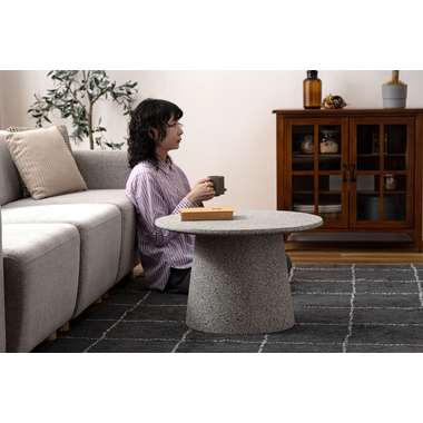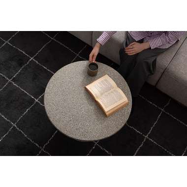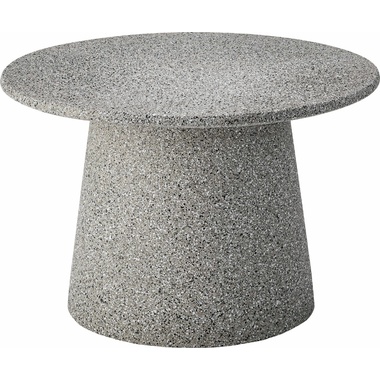洗練された印象をもたらす上品なラウンドテーブル。本物の石のようにざらりとしたシックなテラゾー柄が、空間にやさしい奥行きを加えます。丸みのある天板と安定感のある裾広がりのベースがバランスよくまとまり、上質で心地よいバランスを演出。様々なインテリアと相性よくなじみ、ディスプレイ台としても活躍します。単体ではもちろん、サイズ違いで並べればネストテーブルとしても使用できます。