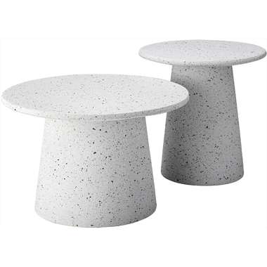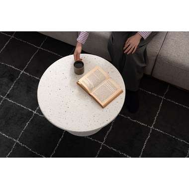 洗練された印象をもたらす上品なラウンドテーブル。本物の石のようにざらりとしたシックなテラゾー柄が、空間にやさしい奥行きを加えます。丸みのある天板と安定感のある裾広がりのベースがバランスよくまとまり、上質で心地よいバランスを演出。様々なインテリアと相性よくなじみ、ディスプレイ台としても活躍します。単体ではもちろん、サイズ違いで並べればネストテーブルとしても使用できます。