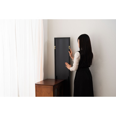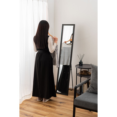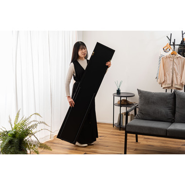 細身の木枠が洗練された清潔感を醸し出す、2WAY仕様のスタンドミラー。 スタンドミラーとしてはもちろん、スタンド脚を外すことで壁掛けミラーとしても使用でき、ライフスタイルに合わせた使い方が可能です。シンプルな佇まいで、置く場所を選ばず、お部屋をすっきりと開放的に演出します。使わない際はコンパクトに折りたたみ、家具の隙間に収納できる省スペースさも魅力です。