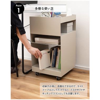 ●収納力が高く移動もできるので、サイドテーブルとしてだけでなくデスクサイドやキッチンワゴンとしても活躍。