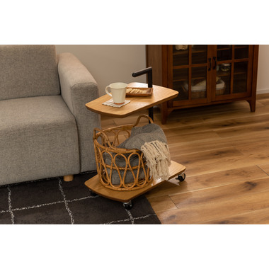 ■北欧風でシンプルなデザインのサイドテーブル。コンパクトサイズなので様々な用途で活躍。■キャスター付きなので移動もスムーズ。ストッパーも付いているので固定させておくこともできます。■天然木オーク(突板仕様)の豊かな表情を感じる天板とスチール素材とのバランスが絶妙な北欧デザイン。天板上のパイプはハンドル形状になっているので移動時に便利な仕様。■上の棚板にはマグカップやボトル類を、下の棚板にはバスケットやゴミ箱等を置ける使いやすい設計。■下の棚板は床から9cmの高さなので、ソファやベッドの下に入りやすいサイズ。手元に引き寄せて使える便利なサイドテーブル。