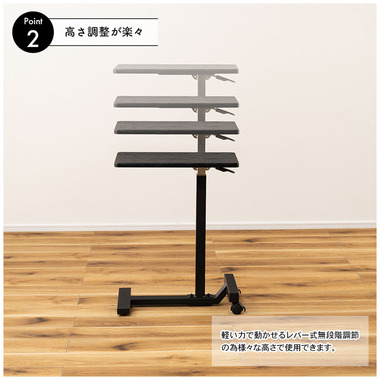 ●軽い力で動かせるレバー式無段階調節の為、様々な高さで使用可能。