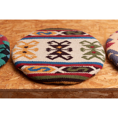 ●中近東の織物『キリム』でできたシートクッション。●温かみのあるオルテガ調模様のクッションはデザイン性のあるインテリアやシンプルなお部屋にも合わせられるワンポイントアイテムです。●座面部分にクッションがないチェアやベンチ、スツール等に合わせてクッション性とデザイン性の両方を楽しむ事ができるシートクッション。●持ち運びに便利なサイズなのでアウトドアやキャンプ等に持っていくのも良いですね。