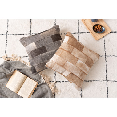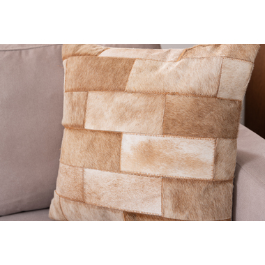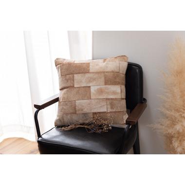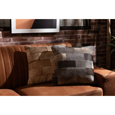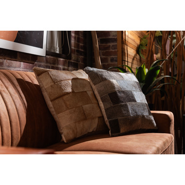 ●魅力的な風合いを持った高級感あふれるクッション●毛足の短い牛革を使用しています。トーンをそろえた様々な毛色をパッチワークでデザインされた個性的な表情が魅力です。