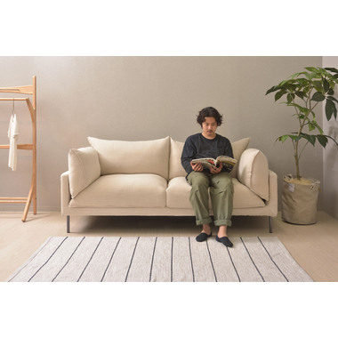 細いスチール脚と重厚感のあるクッションのバランスが魅力的なモダンデザインのソファです。ボリュームのあるクッションが体全体を優しく包み込みます。