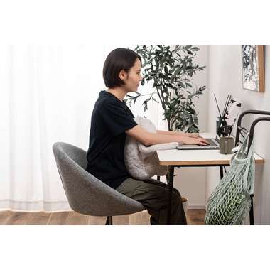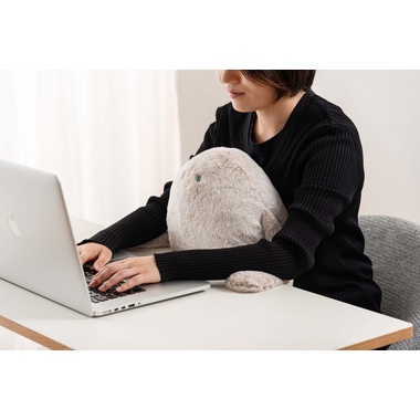 デスクワーク中もリラックスタイムも、やさしく身体を支えてくれるお座りクッション&ぶら下がりクッション。お座りクッションは、おなかに抱えて使うことで自然と背筋が伸び、猫背を防止。デスクワークや読書の際には腕を支えるアームレストとして使用できます。側面のポケットに手を入れてぬくもりを感じられます。ぶら下がりクッションは、ボディに2つのボールを内蔵。もたれるだけで背中に当たり、心地よくリフレッシュさせてくれます。軽く重みを持たせた手の先が、背もたれに掛けたときの安定感をサポートしてくれます。滑らかで柔らかい生地と穏やかな表情が空間にやさしくなじみ、様々なインテリアのアクセントになります。