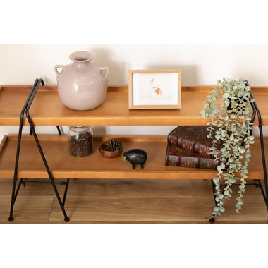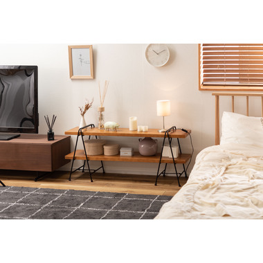 ●折りたたみ(フォールディング)できるシェルフ。●天然木とスチールの組み合わせでデザイン性抜群。●簡単に設置ができるのでイベント会場やフリーマーケットなどアイデア次第で自宅以外でも活躍します。 ●コンパクトに折りたたむことができるので、使わない時や移動の時は狭い隙間に収納可能。●天然木(パイン)を使用した風合いのあるシェルフ。棚板のサイド部分も同じ天然木で縁取りをしたこだわり仕上げ。●フレームの脚先にはアジャスターが付いているのでガタツキ調整も可能。●脚の下段部分にはロックバーが付いているので、脚が勝手に閉じてしまう事もなく安心です。