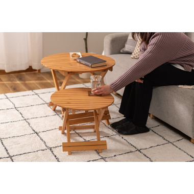 ●工具不要で簡単組み立て、ワンタッチで折りたためる便利なラウンドテーブル。●折りたたみ時の“持ち手”で移動もしやすく、様々なシーンで大活躍。●コンパクトでちょうどいいサイズ。●大・小を組み合わせてネストテーブルとしても使えます。●折りたたみ時の厚さは、Sサイズで5cm、Lサイズで6cmと薄型に。ベッド下やクローゼットなどの隙間に収納が可能。●脚裏にはフェルトが付いているので床への傷防止にもなり安心です。