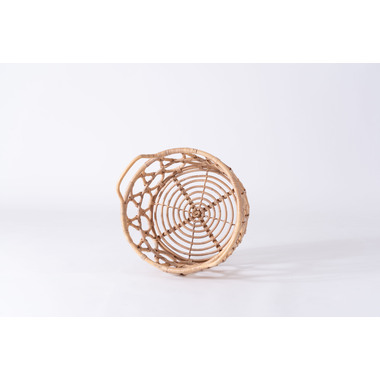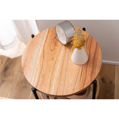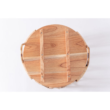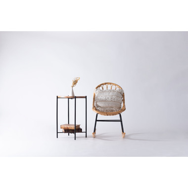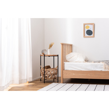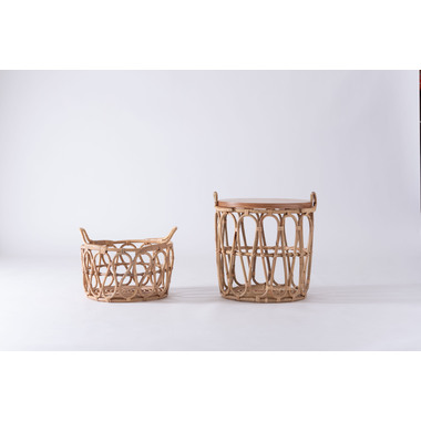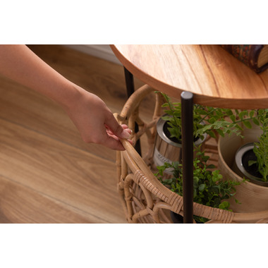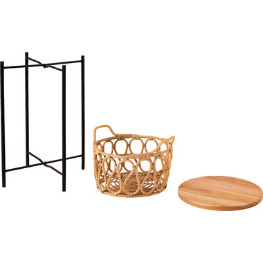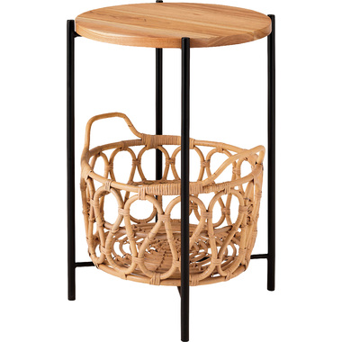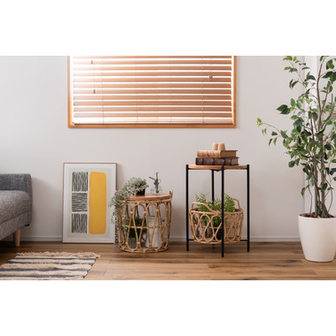 天板のウッドやバスケットのラタン素材があたたかさを演出しながら脚部にスチールを使用する事で引き締まった印象に。
