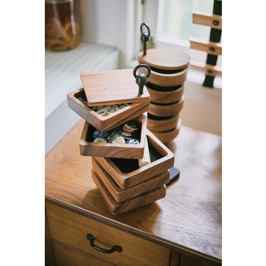 ●天然木の質感とシルエットが特徴的な小物入れ。●収納力とデザイン性を兼ね備えた仕上がりで空間を引き立てます。●1本のスチールに取り付けられた5個の収納ケースが幾何学的に動く、デザイン性溢れる卓上ケース。●書斎やリビング、玄関回りのヴィンテージテイストのオブジェとしてもおすすめ。●収納ケースの内側底面は高級感のあるベロア生地を使用。アクセサリー等の収納にも。