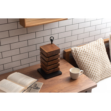 ●天然木の質感とシルエットが特徴的な小物入れ。●収納力とデザイン性を兼ね備えた仕上がりで空間を引き立てます。●1本のスチールに取り付けられた5個の収納ケースが幾何学的に動く、デザイン性溢れる卓上ケース。●書斎やリビング、玄関回りのヴィンテージテイストのオブジェとしてもおすすめ。●収納ケースの内側底面は高級感のあるベロア生地を使用。アクセサリー等の収納にも。