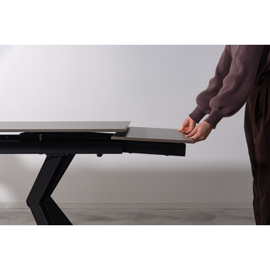 スタイルに合わせて伸縮できるエクステンションテーブル 上品でモダンなデザインが魅了するエクステンションテーブル。洗練されたデザインが高級感を与えます。サイドにスライドすることで幅を広げることができ、生活スタイルやシーンに合わせ使うことができます。天板は傷や汚れに強く、耐熱性の高いセラミックを採用。スタイリッシュなブラックスチールの脚部が目を引き、上質な印象を与えます。
