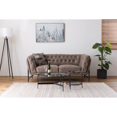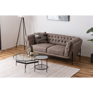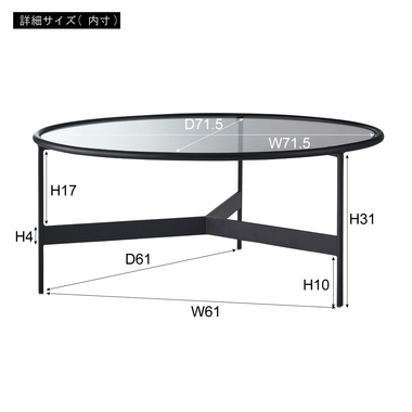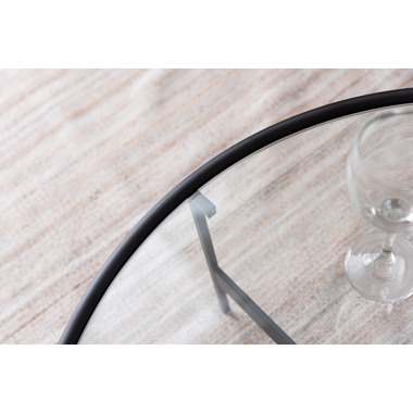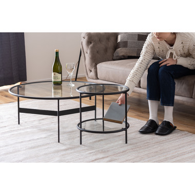 ●シンプルでスタイリッシュなガラステーブル●マットなブラックアイアンの滑らかな曲線とハードなガラスを組み合わせたテーブルに新サイズが登場しました。リビングテーブル/サイドテーブルとして使用したり、2台並べてネストテーブルとしても使用できます。脚部は10mm角のシャープなラインが際立ち、透明なガラス天板との組み合わせは圧迫感の無い開放的な空間を演出します。●ガラス天板は取り外しが可能●フェルト付きのガラス受け●天板は枠より下側にあります●床への傷を防止する保護キャップ付き