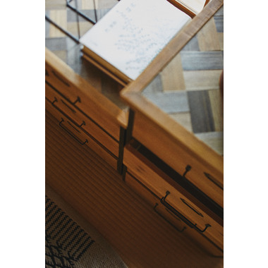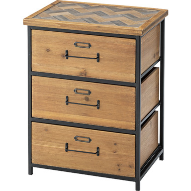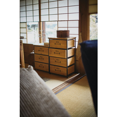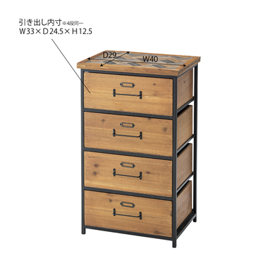●和風テイストを取り入れた、ヴィンテージスタイルのチェスト。●天板面はヘリンボーン柄で仕上げたこだわり仕様。●天然木(杉)の風合いを活かしたデザインなので、和室・洋室どちらにも合わせられる使いやすいデザイン。●引き出しが3杯付いているので、たっぷりと収納できます。●引き出しの前板にはラベルフレームが付いているので、仕分け収納に便利。