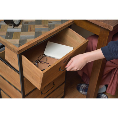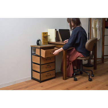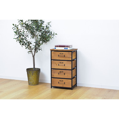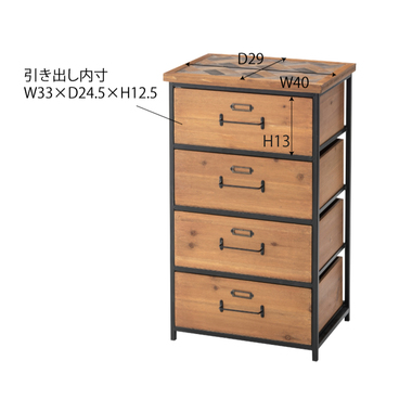 ●和風テイストを取り入れた、ヴィンテージスタイルのチェスト。●天板面はヘリンボーン柄で仕上げたこだわり仕様。●天然木(杉)の風合いを活かしたデザインなので、和室・洋室どちらにも合わせられる使いやすいデザイン。●引き出しが4杯付いているので、たっぷりと収納できます。●引き出しの前板にはラベルフレームが付いているので、仕分け収納に便利。