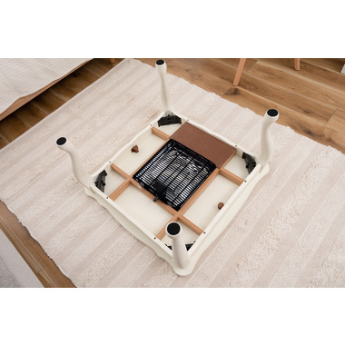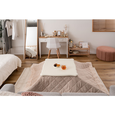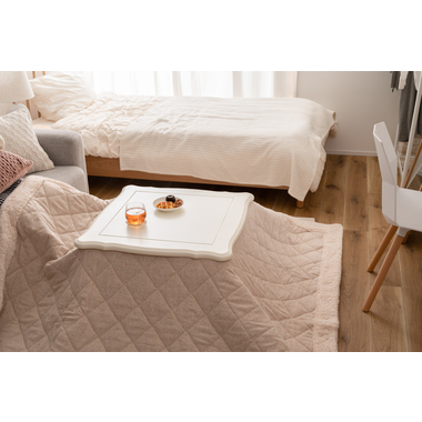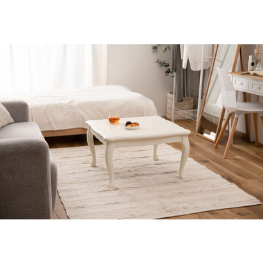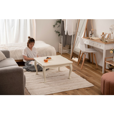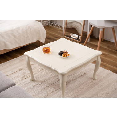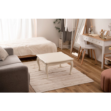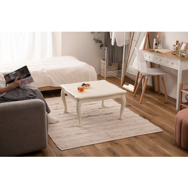 ●天板の装飾や猫脚のクラシカルなデザインはシーズンを選ばずお使い頂けます。●ホワイトカラーと天板のデザインは、布団を掛けても元々のイメージはそのままに、クラシカルでガーリーな雰囲気を演出してくれます。●天板や脚の細部にもこだわった猫脚コタツ。テーブルそのものとしてのデザイン性が高く、オフシーズンもインテリアに馴染みます。●リビングテーブルに近いサイズなので圧迫感なく使えます。●間取りにとらわれないコンパクト設計なので、TVボードを置いた空間でも窮屈さを感じさせず使えます。●ヒーターは天板下の幕板にスッキリと納まる設計となっているので、コタツ感のないオールシーズン使えるテーブル。●正方形:4面使えるちょうど良いサイズ。コンパクトでも対面使用が出来る正方形の定番サイズ。●長方形:奥行をコンパクトにしたサイズ。オフシーズンでも使えるようリビングテーブルに近いサイズ。