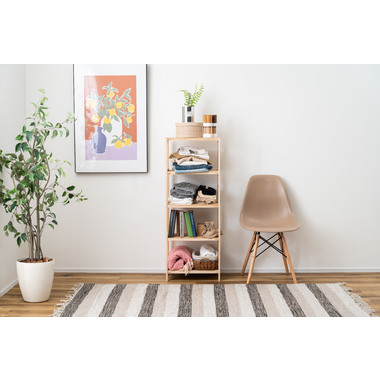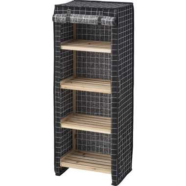 ●棚がすのこ状になっているので、荷物を置いた面への熱がこもりづらい仕様。●底面以外ファブリックで覆われているので、ほこりが入りづらく清潔。●シェルフの前面はのれん状になっているので、生地をくるくると巻いてマジックテープの付いた紐で留めておくことができます。●4段タイプなので、ちゃんと仕分けをしながらたっぷり収納。●幅45×奥行30cmとスリムサイズなので、ワンルームや子供部屋、ランドリースペースにも置けるサイズ。●付属の工具ですぐに組立られる簡単組立シェルフ。●ファブリックのカバーを外して、オープンシェルフとしても。