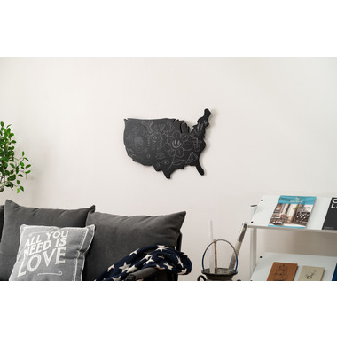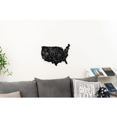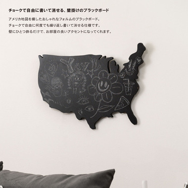 ●チョークで自由に書いて消せる、壁掛けのブラックボード。●アメリカ地図を模したおしゃれなフォルムのブラックボード。●チョークで自由に何度でも繰り返し書いて消せる仕様。●壁にひとつ飾るだけで、お部屋の良いアクセントになってくれます。●黒板素材を使用しているので、チョークで自由に書き込む事が出来ます。●イラストを描いたり、伝言板にしても◎。●書き込んだチョークは簡単に消す事が出来るので、何度でも書き直しが可能。●裏面に金具が付いているので壁に掛けて使う事が出来ます。