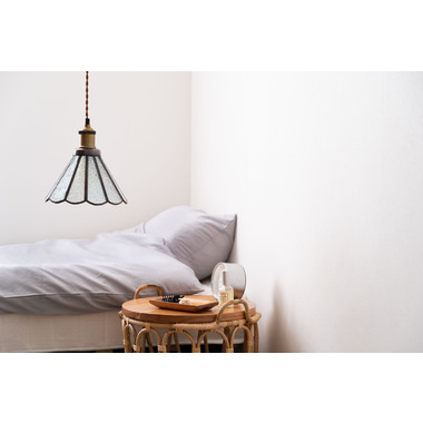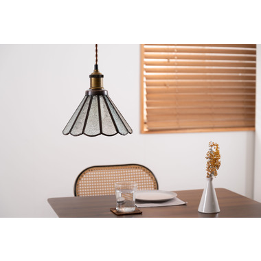 レトロ感漂うペンダントライト。ステンドグラスのシェードは立体的な模様が特徴的。どこか懐かしいノスタルジックな雰囲気を感じさせます。一灯はもちろん。広範囲には多灯付けがおすすめです。●形も特徴的なステンドグラス。シンプルだけど可愛らしいステンドグラスは消灯時にも立体的なデザインがインテリアとして演出してくれます。●点灯時の表情の変化。シェードの内側は光を反射して美しいデザインを楽しめます。消灯時とはまた違った表情をお楽しみください。●ご家庭のシーリングプラグに付けられます●コードの長さを調整できます