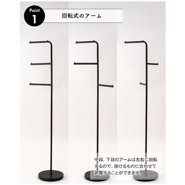 ●中段と下段のアームは左右に回転し、掛けるものに合わせて調整が可能。