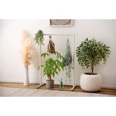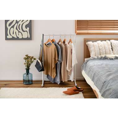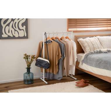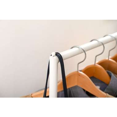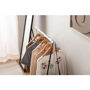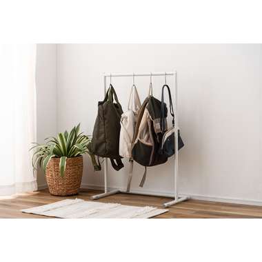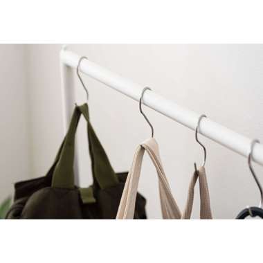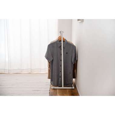 置く場所や用途に寄り添い、さまざまなシーンで活躍するハンガー。すっきりとしたフレームとマットなスチールの質感が空間になじみ、静かな雰囲気を演出します。洋服を掛けてコーディネートを楽しむだけでなく、玄関やリビングでは掛 けるアイテムによってディスプレイラックのようにも使えるのが魅力です。省スペース設計のため、壁際やベッドサイドなどの限られたスペースにもすっきりと収まり、空間を落ち着いた印象にまとめてくれます。