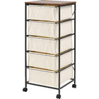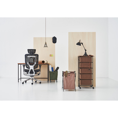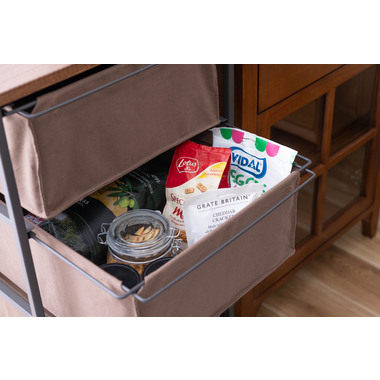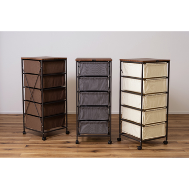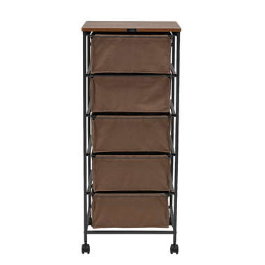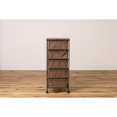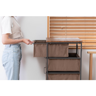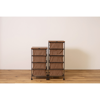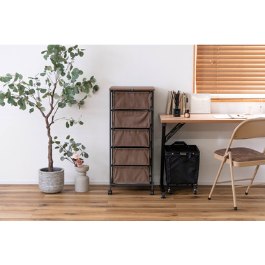 ●お部屋のインテリアにもなじみやすく、使い勝手のいいキャンバスチェスト。●ダイニングや玄関、寝室、洗面所、キッチンなど、様々なシーンの収納として使えます。●脚部はキャスター付きで移動もラクに行え、ストッパーも付いているのできちんと固定することもできます。●天板はインテリア性のある木目調のシートを使用。角は丸く仕上げてあるので安心です。●天板正面にはワンポイントデザインとして小さなプレート付き。●引き出しには取っ手が付いているのでスムーズに出し入れできます。