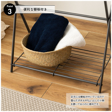 ●足元には棚が付いているので畳んだタオルやちょっとした小物を置いておくのに便利。