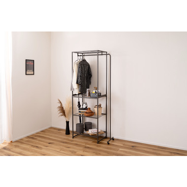●伸縮可能なハンガー機能付きのスチールラック●シンプルで、置く場所を選ばないスチール製のラック。伸縮機能が付いたハンガーが付いており、衣類を掛ける量やお部屋の広さに合わせて、ハンガーの幅を調整する事が出来ます。●ラックの脚はアジャスター付きでガタつきを防止します●ハンガーの脚はキャスター付きで伸縮をスムーズにしてくれます●ワンタッチで簡単伸縮●ずり落ち防止のストッパー