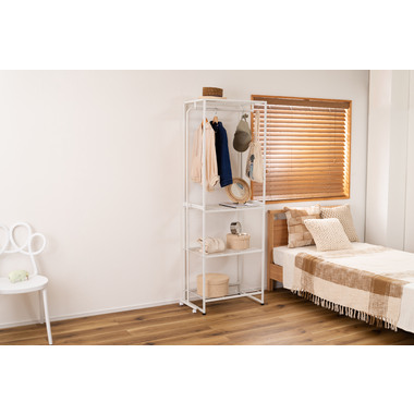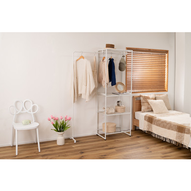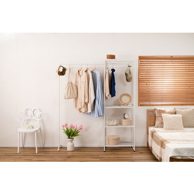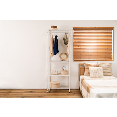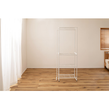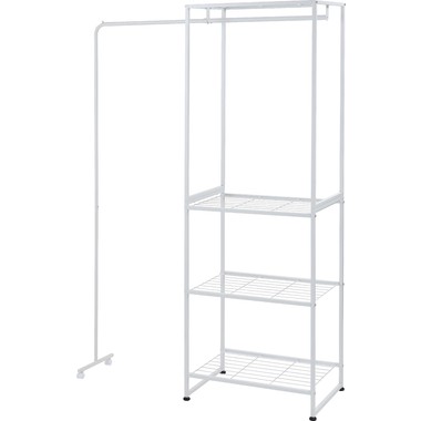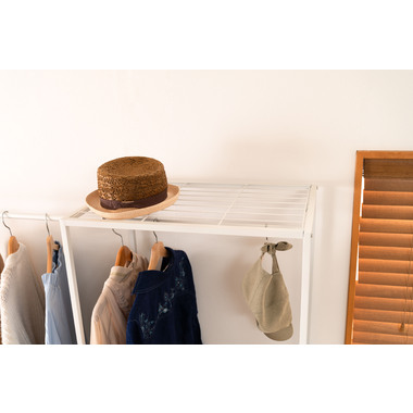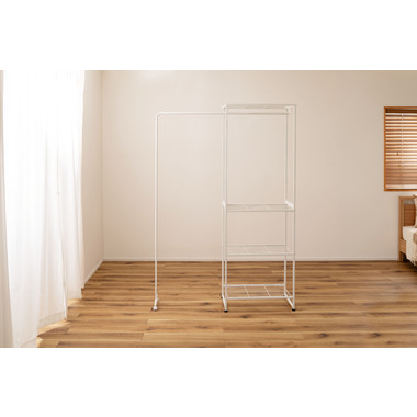 ●伸縮可能なハンガー機能付きのスチールラック●シンプルで、置く場所を選ばないスチール製のラック。伸縮機能が付いたハンガーが付いており、衣類を掛ける量やお部屋の広さに合わせて、ハンガーの幅を調整する事が出来ます。●ラックの脚はアジャスター付きでガタつきを防止します●ハンガーの脚はキャスター付きで伸縮をスムーズにしてくれます●ワンタッチで簡単伸縮●ずり落ち防止のストッパー