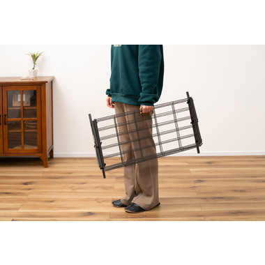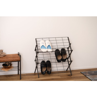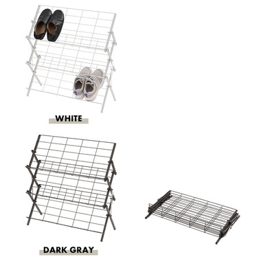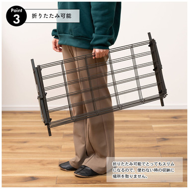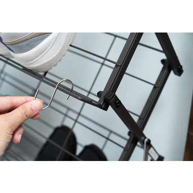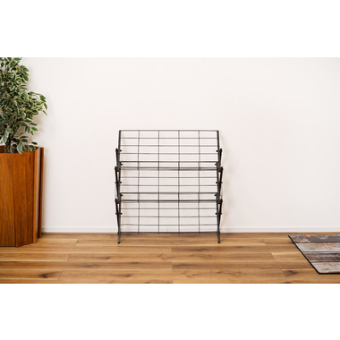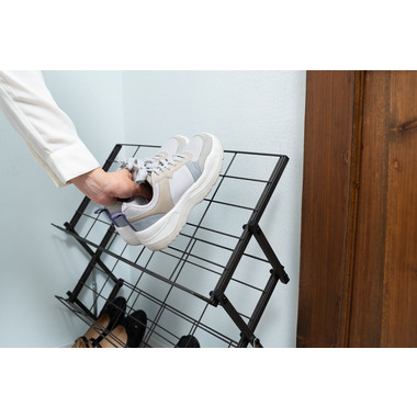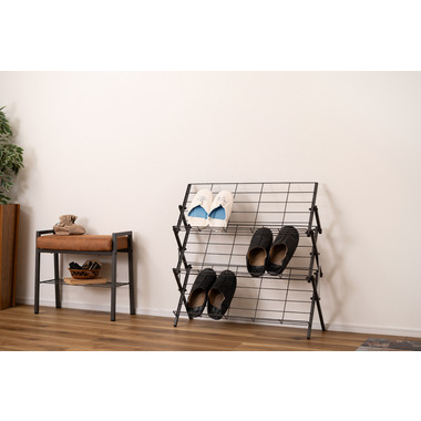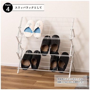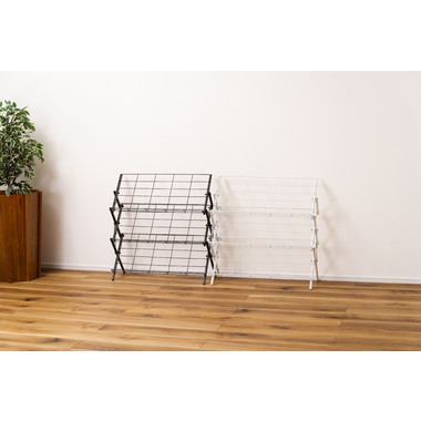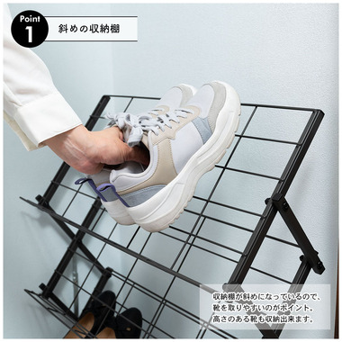 スチール素材で通気性も良く、見た目もサイズもスッキリとしたデザインのシューズラック。更に、折りたたみが可能なので、使わない時は場所を取らずに収納しておけます。●斜めの収納棚で、取りやすい設計●かかと部分のストッパーで靴が滑りにくい●折りたたみ可能で省スペース収納●スリッパラックとして●コレクションラックとして●フックが掛けられるので靴べらや折りたたみ傘の収納も