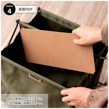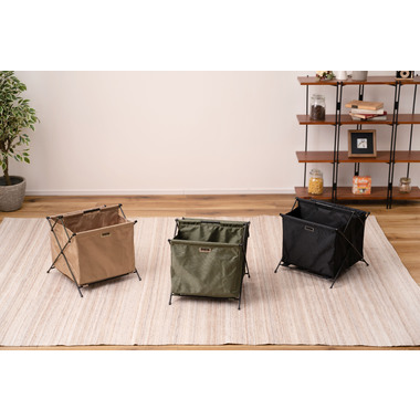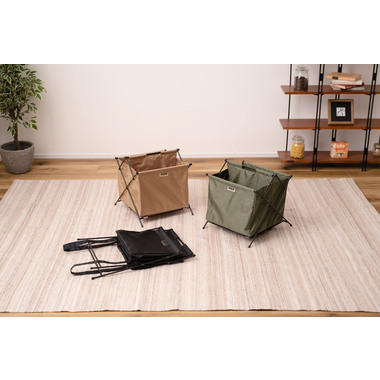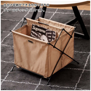 ●仕分け収納ができる仕切り付きフォールディングバスケット。●二つに仕切られたバスケットは、自分好みに仕分けて収納。●両端を内側に押し込むだけで折り畳むことができ、中央には取っ手が付いているので持ち運びラクラク。●使わない時は折り畳んでちょっとした隙間に収納が可能。●MDFの底板が付いているので、しっかり綺麗に収納をサポート。●脚先キャップ付きで床への傷防止になり安心。●アウトドアテイストの落ち着いたカラーで、どのお部屋にもしっくりと馴染みます。