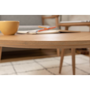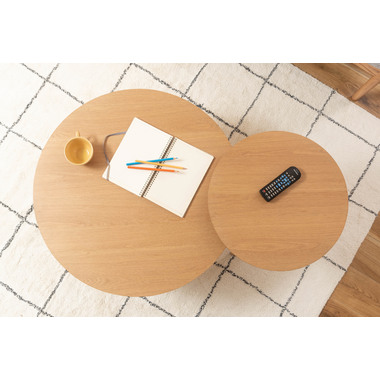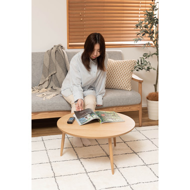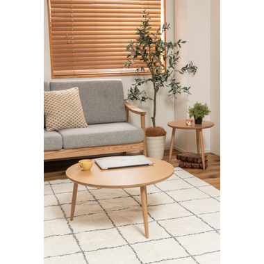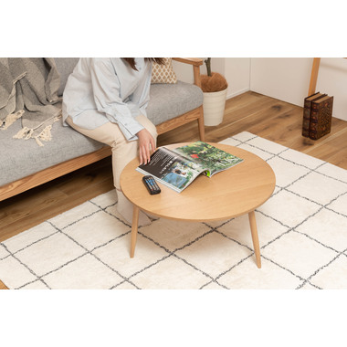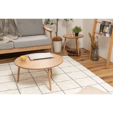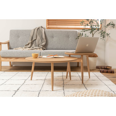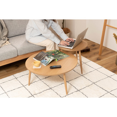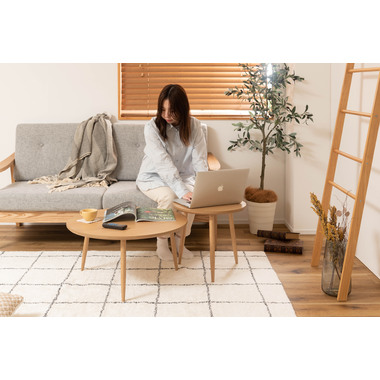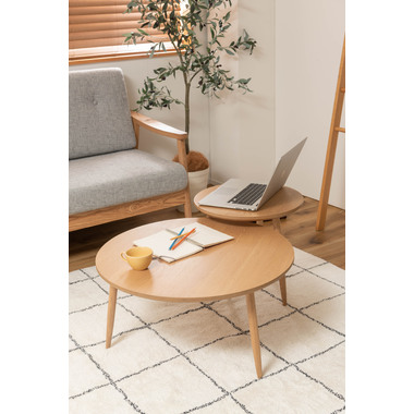 ●いろいろな使い方ができ、ナチュラルな空間を演出する2typeのラウンドテーブル。●木目が美しいホワイトオークを使用。清楚感があり上品な色味と木目が特徴で、ナチュラル系インテリアの代表的な材として、オーク材の魅力を活かしたシンプルなデザイン。●それぞれ、サイドテーブルやリビングテーブルとして使用するほか、SサイズとLサイズを組み合わせてネストテーブルとして使用すれば、リビングの空間もインテリア性が高く仕上がります。●また、シンプルで細い三本の脚がテーブル全体をコンパクトに、足元をすっきりと広くみせてくれます。