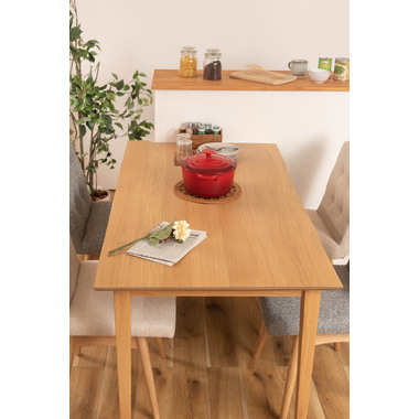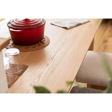 ●ホワイトオークの木目を活かした、シンプルなデザインのダイニングテーブル。●木目が美しいホワイトオークを使用。清楚感があり上品な色味と木目が特徴で、ナチュラル系インテリアの代表的な材として、オーク材の魅力を活かしたシンプルなデザイン。●脚は天板側から床側にかけて徐々に細くなっていくテーパードレッグ。ダイニングスペースが重くなりすぎず、様々なチェアに合わせられるデザイン。●天板のエッジは斜めにカットしデザイン性の高い仕上がり。●サイズ展開は省スペースでも使いやすい135センチと、4人で座ってもゆったりと使用できる150センチの2種類からお選びいただけます。●木目の表情を活かした天板が食卓に彩りを与えてくれます。