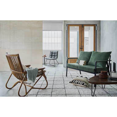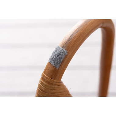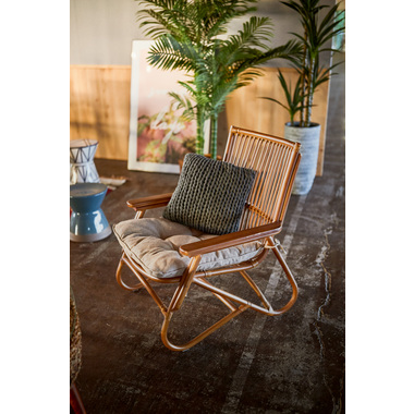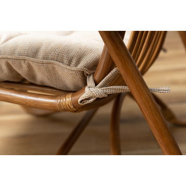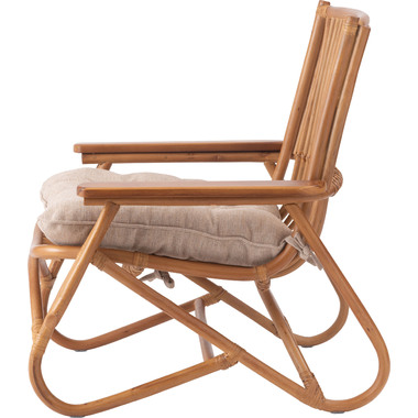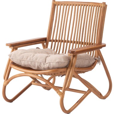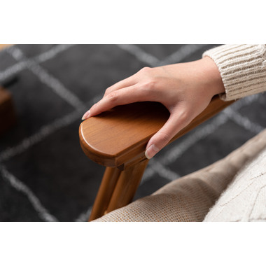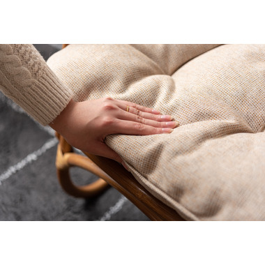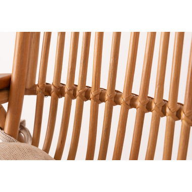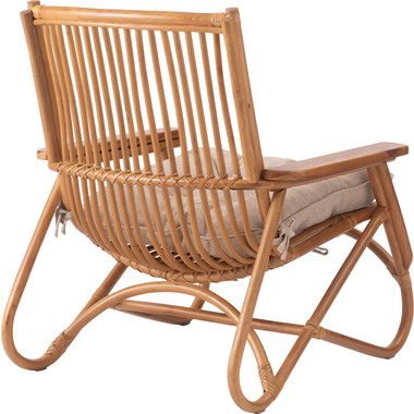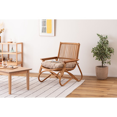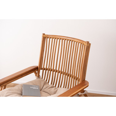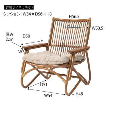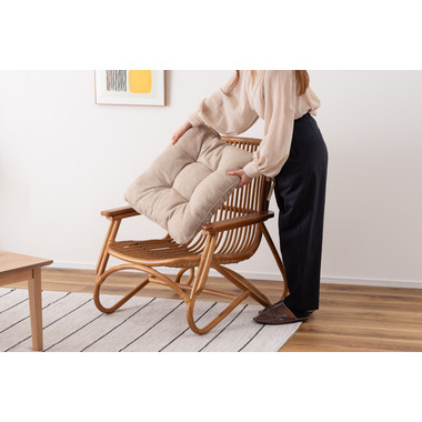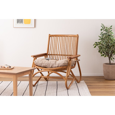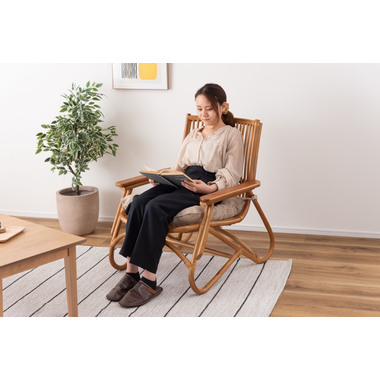 ●脚のカーブが美しい、天然木×ラタンのパーソナルチェア。●ゆったりと座りやすい形状と、印象的なデザインが特徴です。●肘掛けには天然木(チーク)を使用。天然木のぬくもりがしっかりと手に馴染みます。●ラタン(籐)ならではの、しなやかで柔らかい曲線も魅力の一つです。●背もたれには緩いカーブを掛けているので、ゆったりとくつろぐことができます。●ほどよいクッション性のある座面クッションは取り外しが可能です。