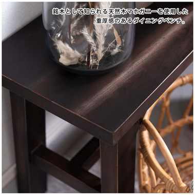 ●銘木として知られる天然木マホガニーを使用した、重厚感のあるダイニングベンチ。