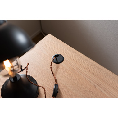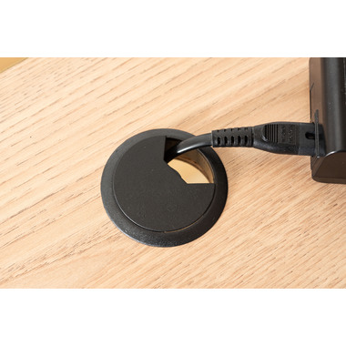 ●デスクは強度の高い木目調のメラミンシートを採用。お手入れも簡単でいつでも清潔な状態をキープする事ができて安心です。フチ部分は積層合板のシートでアクセントを入れたこだわりデザイン。天板の左右にコード穴を付けてあるので、配線処理も楽に行なえます。