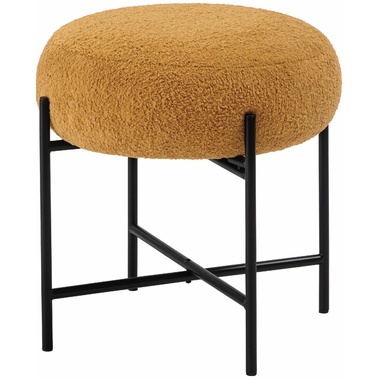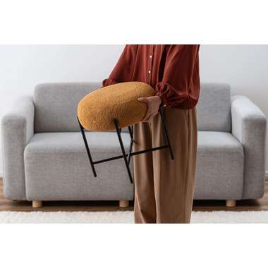 マットな質感のブラックスチールと、落ち着いた色味の生地が織りなすコントラストが目を引くスツール。立体感がありやさしい丸みを帯びた座面が、空間に優しい雰囲気を与えます。スチール脚が全体の印象を引き締め、様々なインテリアと相性よくなじみます。