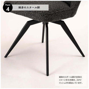 ●細身のスチール脚が全体のイメージを引き締め、スタイリッシュさを演出。