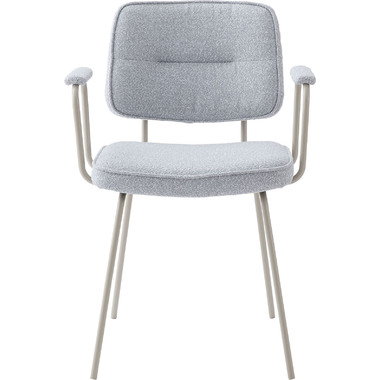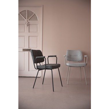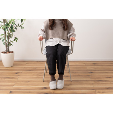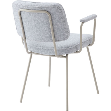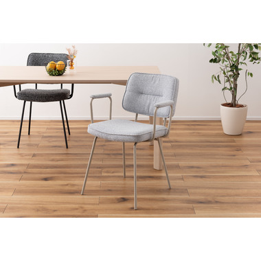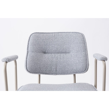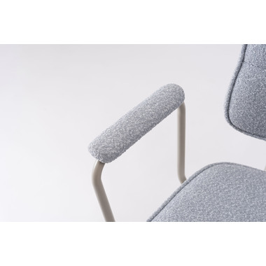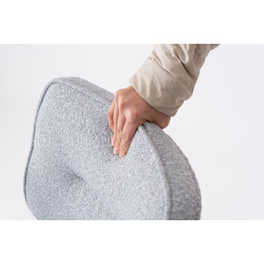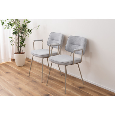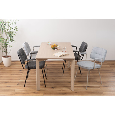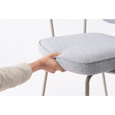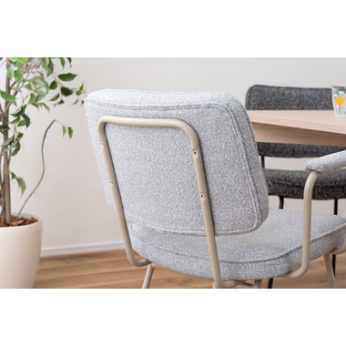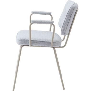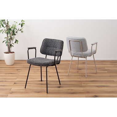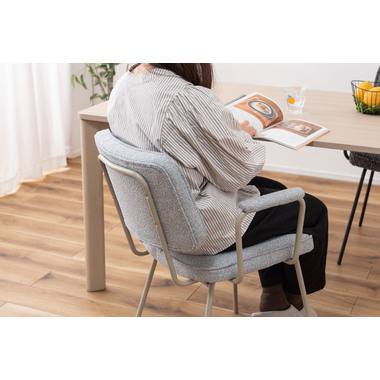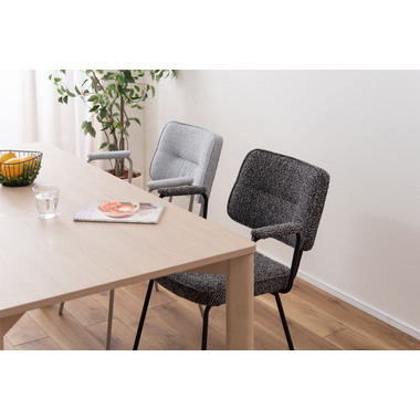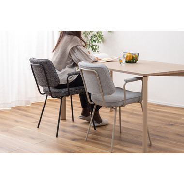 アーム部分に特徴的なデザインを施したチェア。ファブリックには混色のブークレ生地を使用し、表情のあるデザインに仕上げました。デザイン性と使いやすさ、快適さを兼ね備えたアイテムです。