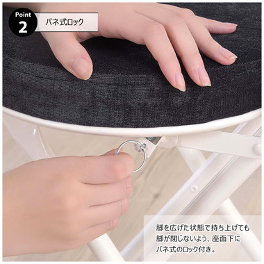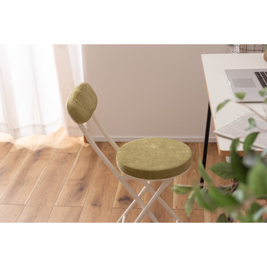●座り心地の良い厚みのある座面と背もたれ。●程よく弾力があるので、いつまでも座っていられる座り心地。●脚を広げた状態で持ち上げても脚が閉じないよう、座面下にバネ式のロック付き。●折りたたみ式なので使わない時はすっきりとコンパクト収納。●リビング、ダイニング、キッチン、洗面所、玄関周りのちょっとした隙間に収納可能。●軽量仕様なのでお掃除の時の移動や持ち運びもらくらく。●座面には手触りが良く高級感のあるベロア調生地を使用。●座面サイズは30cmと使いやすいサイズ。来客用に、作業用に、ちょっと休憩用に便利なサイズ。●脚先キャップが付いているので床への傷防止にもなり安心。
