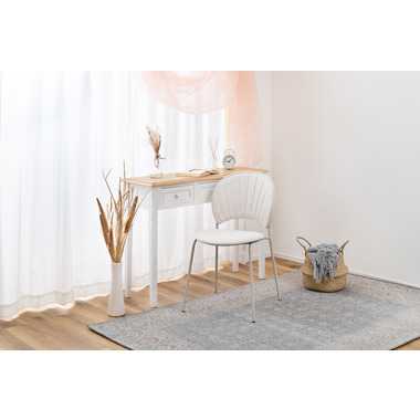 柔らかい曲線と優しいカラーリング まるで貝殻のようなデザインが目を引くチェア。スタイリッシュなライトグレー色の脚とペールカラーの生地の組み合わせが優しい雰囲気を演出します。