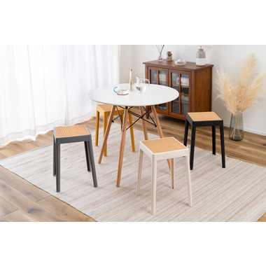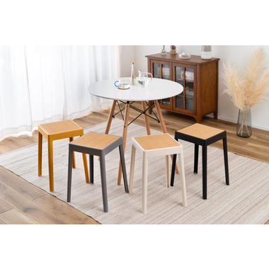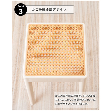 温かみのあるかごめ編み調 シンプルなフォルムの中に装飾されたかごめ編み調の座面が目を引き、お部屋のアクセントになります。ポリプロピレン製なので軽量で、耐久性があり汚れた時にお手入れがしやすいです。スタッキングが可能なので、使わない時は場所を取らずに収納することができます。