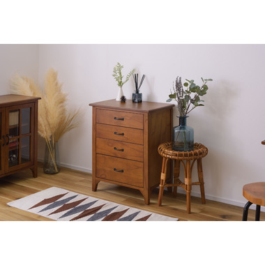 ●天然木の豊かな風合いと統一感のある黒アイアンが特徴の定番人気シリーズ「ティンバー」にミニチェストが登場。●スリムなサイズ感で限られた空間にも設置できます。●引き出しが4杯ついている収納力のあるミニチェスト。●一番下の引き出しのみやや大きいサイズになっているので、より多く収納したい場合は一番下の引き出しへ。●脚裏にはフェルトが付いているので、床への傷防止になり安心。●アイアンの取っ手と風合いのある天然木のヴィンテージ感漂うミニチェスト。